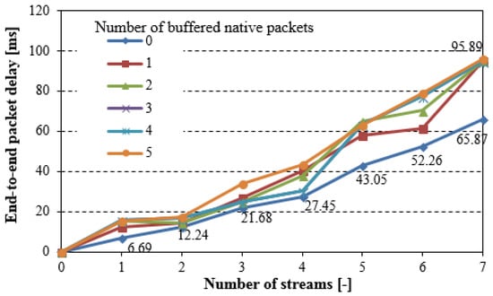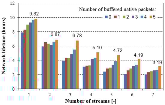 A relatively low value of the network lifetime is a result of high traffic sent in the network during each experiment. In real WSNs, such traffic typically appears occasionally, thus the network lifetime is incomparably better. Nevertheless, an activation of the NC during higher traffic periods brings an increase in the lifetime. For example, for seven streams that were sent over the network, we can observe that estimated network lifetime is increased by about 60% if the NC is applied (with five native packets buffered in the NC buffers), when comparing to the network without the NC. Since the NC6LoWPAN mechanism is applied in real sensor motes and the results come from the experiments conducted in the real network, we mainly focused on the confirmation that the NC can bring benefits in overall traffic sent in the 6LoWPAN-based network, and in consequence, we can achieve lower overall energy consumption and a longer network lifetime. Moreover, the better benefits can be reached if the network is highly loaded. The NC6LoWPAN optimisation and its adaptation to specific applications used in the WSNs is left for further investigations.