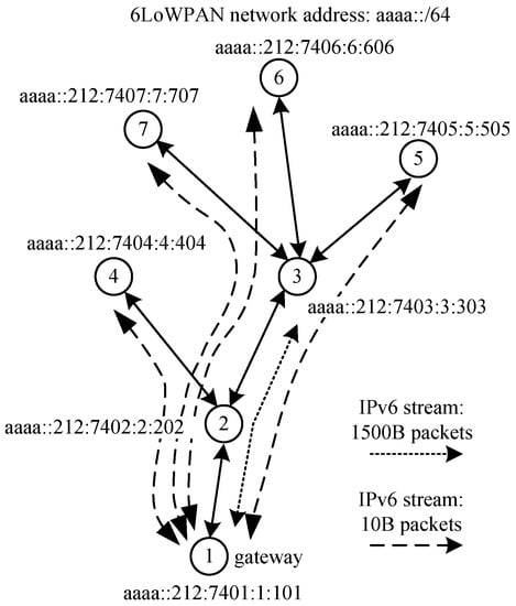 In [36], the 6LoWPAN RFC4944 standard was introduced to support IPv6 packets transmission in the IEEE802.15.4-based sensor networks. The Maximum Transmission Unit (MTU) of the IPv6 streams cannot be smaller than 1280B, while the IEEE 802.15.4 standard offers a maximum frame payload of 127B [37]. The 6LoWPAN provides an adaptation layer that is located between the MAC layer and the IPv6 protocols stack. Additionally, it ensures IPv6 packets fragmentation to cope with small payloads. Besides, it allows for deep headers compression, in order to minimise the upper layers overhead. Since the IEEE802.15.4 standard offers a maximum 250 kbps data rate, the IPv6 protocols stack overhead would significantly reduce the network goodput. To increase sensor nodes resources utilization, the 6LoWPAN proposes—as an option—the so-called route-over routing mechanism. Fragments of IPv6 packets are transmitted to the destination nodes without reassembling at intermediate nodes, and without forwarding the full IPv6 packets at the network layer. This overcomes the problem of a larger memory size that is required in the nodes to collect fragments before reassembling. Unfortunately, in lossy sensor network, the route-over routing increases the packet loss ratio. Therefore, the traditional forwarding method (mesh-under routing) is often applied in the software used in sensor motes (i.e., in the Contiki Operating System).