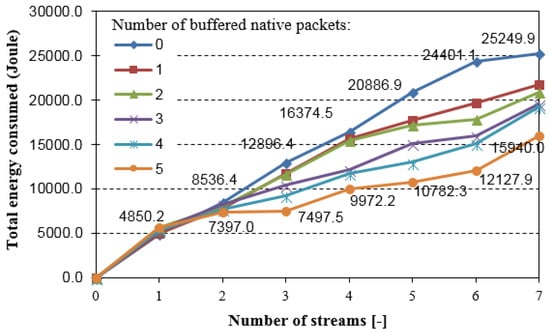 The highest energy consumption gain was observed when six streams were transmitted simultaneously in the network. Using the NC6LoWPAN, about 7% of the total energy was saved. It should be emphasized that the experiments were performed with a relatively high traffic volume generated during more than 1 hour, by each node of the networks (high total energy consumed). We can expect that the traffic will be much lower in many cases of the WSN. Thus, coding opportunities can also be decreased, and consequently, the energy consumption efficiency can be lower. Nevertheless, the results confirm that the NC6LoWPAN can be effectively used in the 6LoWPAN-based networks.