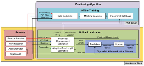 The positioning algorithm can be broken down into two main component parts: offline training and online localization. In the offline phase, the RSS fingerprints obtained from WiFi APs and iBeacons using the smartphone and the heading information of the user gained by the accelerometer and the gyroscope on the phone are collected at selected locations in the area of interest and are sent to the server. Then, a machine learning method, such as ANN, KNN, NBC, and SVM, on the server side converts the collected fingerprints (RSS readings and user’s heading) into vectors (fingerprint database).