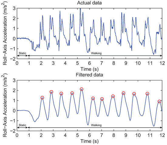 As can be seen in Figure 2 (top), there are high frequency noise and spikes in the raw readings from the accelerometer. To smooth the raw measurements, 10th-order Butterworth low pass filter with a cut-off frequency is applied to them. The cut-off frequency is set to 3 Hz based on our experimental results obtained from 50 subjects between the ages of 25 and 35 with various walking speeds, and it can provide the step detection with high accuracy. The smoothed data after the filtering are represented in Figure 2 (bottom).