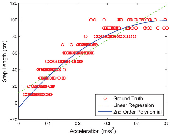which is obtained by fitting them to the second order polynomial using polynomial regression, where l is the estimated step length, p is the maximum peak magnitude of the three-axis accelerations, and , , and are the polynomial coefficients. Our experiments show that , , and result in a high correlation between the actual step length and its estimated value l by the smartphone in the test environments described in this paper.