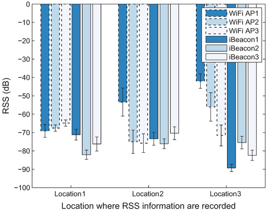 The GPS operates poorly due to weak and blocked satellite signals in indoor environments. Therefore, it is difficult to obtain the measurement for the user’s location indoors. To determine the user location in such environments, there are many approaches based on alternative signals, such as acoustic, infrared, and RF. Since RF signals can easily be measured at receivers, such as WiFi and Bluetooth devices, many of the existing localization approaches leverage RSS fingerprints. Figure 4 represents the RSS values measured at adjacent locations (three orange circle points) in the test site described in Section 5. As can be seen in Figure 4, although the fluctuation in the RSS value exists, the value of the fingerprint can be used to distinguish the different locations, since the fingerprint of the same RF transmitter can change remarkably at each location in the area of interest. Because of this property, the fingerprints can also be used to estimate the position of the user located within the area of interest.