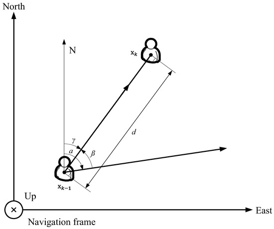 The pedestrian model used to account for the motion of user in our positioning system is shown in Figure 5. The state of the pedestrian at time k can be represented as the vector , where is x-axis and y-axis position in the navigation frame. The navigation frame is the local geodetic frame where the x-axis, y-axis, and z-axis indicate east, true north, and up direction, respectively. Note that z-axis point is not considered for land-pedestrian navigation. Therefore, the state has only the x-axis and y-axis positional information. In this model, the angles and indicate the heading angle of the user at times and k, respectively, and the angle is defined as the counterclockwise angle between state vectors and . The value of d represents the traveled distance of the pedestrian between time steps and k.