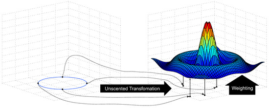 The principle of the SKPF algorithm is shown in Figure 6. The unscented transformation (UT) is designed on the intuition that it is easier to approximate a probability distribution than it is to approximate an arbitrary nonlinear function using the linearization [34,35]. To overcome the deficiencies of linearization for the nonlinear function, the UT propagates the state estimate and its covariance through nonlinear transformations. The SKPF algorithm works in a two-phase process: a prediction (Section 4.4.1.1) and an update (Section 4.4.1.2).