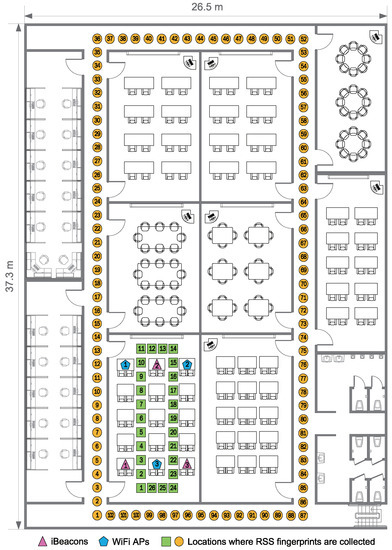 50 users between the ages of 25 and 35 with a variety of walking speeds took part in our experiments. Both green square and orange circle symbols in Figure 7 represent the physical locations where the location sample that consists of RSS fingerprints from both WiFi APs and iBeacons as well as heading information are collected by the user with the mobile phone during the offline phase of the fingerprinting method described in Section 4.2. They are deployed at intervals of one meter with the label (sequence number) of the physical location in the hallways and inside the lecture room. To construct the fingerprint map (database), we collected more than 100 location samples at each physical position.