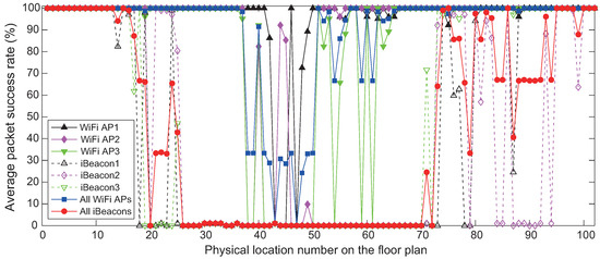 Figure 8 represents the average value of packet success rate (PSR) obtained by RSS values received from all WiFi APs and iBeacons at each physical location in Scenario S2 with poor wireless environments (the orange circle represented in Figure 7). As can be seen in Figure 8, the average value of PSR for the remote location from WiFi AP and iBeacon is less than that for the location close to WiFi AP and iBeacon. The iBeacons in the experiments actually have a transmission range of about 25 m, since their RSS signals can be blocked by obstacles. In Scenario S2, the average value of PSR from all the WiFi APs and iBeacons for every position is about 89.76% and 44.32%, respectively. In contrast, for every physical location of Scenario S1 with good signal condition (the green square in Figure 7), our experimental results (not reported here) show that the average value of PSR from all the WiFi APs and iBeacons is 100% together.