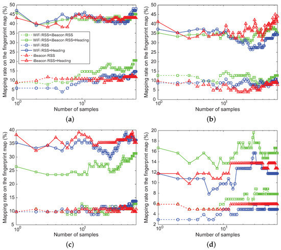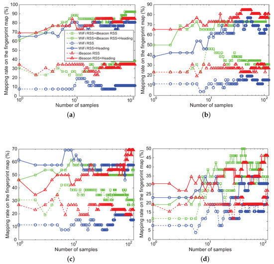 In Scenario S1, as the number of location samples measured in the online phase increases, the mapping rate can reach a higher value. However, since much time is spent collecting the samples, the real-time process of the position estimate is not feasible. On the contrary, in Scenario S2, the ratio of the mapping is not affected by the number of the samples during the online step. Therefore, only one location sample was used for the real-time positioning of the user in our experiments.