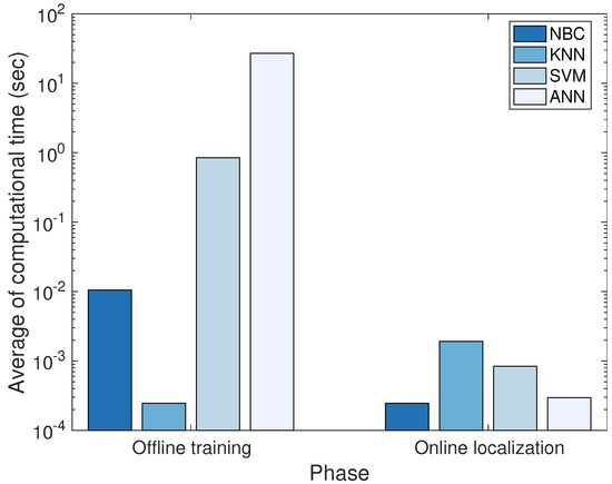 Figure 11 represents the average time in seconds required to construct the fingerprint map with 1536 location samples in the offline phase and the one spent to estimate the positional measurement of the user in the online phase for each of the machine learning algorithms. As can be noticed, even though NBC requires a little more execution time than KNN in the offline phase, it spends less execution time than different machine learning algorithms during the offline and online phases. Figure 9 and Figure 10 also indicate that NBC achieves better performance than other machine learning algorithms in terms of the mapping rate. Hence, the position estimated by NBC instead of GPS is used as a measurement for SKPF at time k in our positioning system.