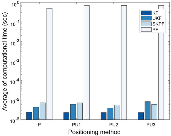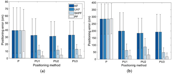 The SKPF can provide higher accuracy of the position estimate than KF and UKF, as shown in Figure 12a,b. In Scenarios S1 and S2, the positioning algorithms (PU1, PU2, and PU3) based on SKPF has the average localization error of about 10.37 cm and 71.63 cm, respectively. In this case, the use of SKPF can achieve about 20.1% and 20.2% higher accuracy than KF and UKF in Scenario S1, respectively, and it can reach about 151% and 152% higher accuracy compared with KF and UKF in Scenario S2, respectively. Furthermore, as illustrated in Figure 12a,b, since the SKPF algorithm has the lower value of the positioning error standard deviation than other Bayes filters, it can execute a more reliable position estimate. This is because, unlike UKF that uses samples (sigma points) with the uniform weight for all system dynamics, SKPF employs samples that have the different weight through the weighting method of PF that evaluates the weight of the sample using the likelihood function proportional to the posterior density. Hence, the SKPF algorithm can offer better positioning performance than KF and UKF and competitive performance compared to PF.