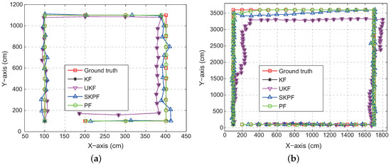 For the computational complexity and memory requirement, KF and UKF scale in general and , respectively, where m denotes the dimension of the measurement and n is the dimension of the state [39,40]. In our test environments, since the value of m is equal to the value of n, we can observe that KF has a less complex method and requires less memory than UKF. PF, which uses many particles (samples), requires substantial computational cost and memory usage to estimate the location of the user. Indeed, both these quantities scale as , where denotes the number of the particles [41]. By contrast, since SKPF can estimate the position of the user with the same samples as UKF that uses a minimal set of samples, the computational complexity and memory requirement of SKPF scales as .