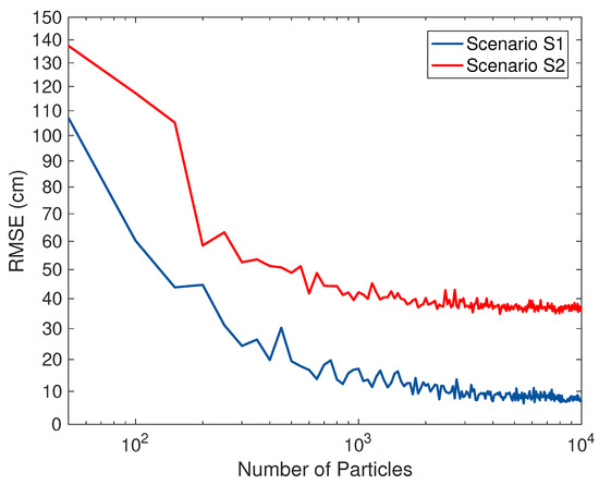 RMSE value between the estimated location by PF and its corresponding actual position versus the number of particles for PF in Scenarios S1 and S2.