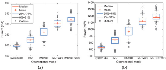 Figure 16 represents the boxplots of the measured current and power from the different operational modes. In this figure, we can observe that modes using RF modules consume more energy compared to that using only IMU sensors, becoming particularly remarkable in the experiments using WiFi module, such as IMU+WiFi and IMU+BT+WiFi. By comparing between IMU+BT and IMU+WiFi, it is also observed that the average current and power for the WiFi module are noticeably higher than those for the Bluetooth device. This is because the Bluetooth device on the smartphone employed in our experiments is based on the low energy technology called BLE (also known as Bluetooth 4.0). Thus, using IMU+BT (i.e., PU2), we can achieve positioning performance with high accuracy and energy efficiency.