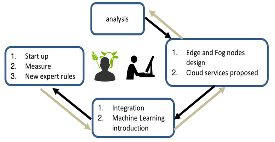 - Start up, measure and feedback: Test and feedback are launched. The first expert rules are integrated with farmer supervision. New rules are designed with feedback processes. Automatic and adapted rules are developed using artificial intelligence systems with machine learning platforms.