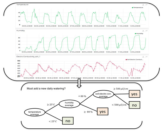 - Obtaining data sets: This refers to a data set with main variables captured and stored to analyse and design the model. In irrigation process data set are: irrigation programming used (time and flow), ambient conditions (humidity, temperature) and soil conditions (humidity, temperature, pH and conductivity) captured by sensors. All this data are monitored and stored.
