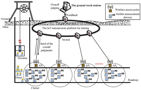 Fog-supported smart city architecture can support several heterogeneous devices to connect to each other [], but it is slightly complicated for the monitoring environment of mine gas. The moving measurement data monitoring network based on IoT architecture is illustrated in Figure 1. A wireless access point with basic pre-analysis and judging programs for mobile measurement data was attached to a switch through a wired connection. When the miners are transported to the underground by the elevator, there may be several miners passing through the same access point at the same time. As the miners with smart safety lamps that are equipped with a portable sensor passed by a wireless access point, the data is pre-analyzed and successively transmitted to the ground work station. Because the mobile measurement points measure the gas data at the same time and in the same space, the data have great correlation. As we know, compressed sensing takes full advantage of the signal’s sparsity, and can be constructed to reduce the amount of transmission data.