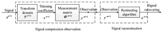 Traditional signal acquisition and processing includes four steps: sampling, compression, transmission, and decompression. The sampling process should satisfy Shannon’s sampling theorem. Compressed sensing performs signal sampling and compressive encoding in a step. As illustrated in Figure 2, compressed sensing takes full advantage of the signal’s sparsity and conducts non-adaptive measurement and encoding on the signal at a sampling rate far lower than the Nyquist sampling rate.