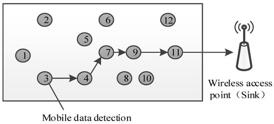 Data were acquired though M time-independent multi-hop communication links with different initial nodes. Each multi-hop network randomly selected an initial node. At each node, the measured gas value was multiplied by the generated random coefficient; then, the product was transmitted to the next node according to the preset routing algorithm. At the next node, the received signal was added to the local product, and the sum was transmitted to the next node. By analogy, the i-th multi-hop signal received by the wireless access point can be written as []: