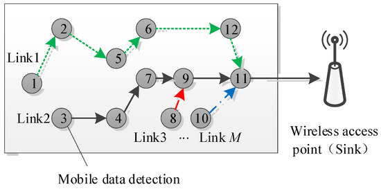 Accordingly, the signals on M time-independent multi-hop communication links with different initial nodes should be collected. As illustrated in Figure 5, by assuming that denotes the i-th multi-hop signal received by a wireless access point (), in which denotes the random coefficient generated at the j-th node in the i-th multi-hop communication link and denotes the gas data measured at the j-th node, the receiving vector of M multi-hop communication links was denoted as , i.e., .
