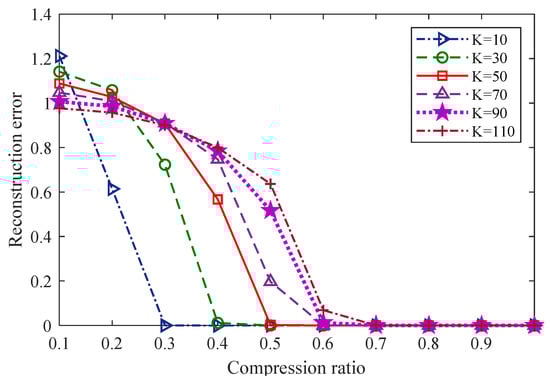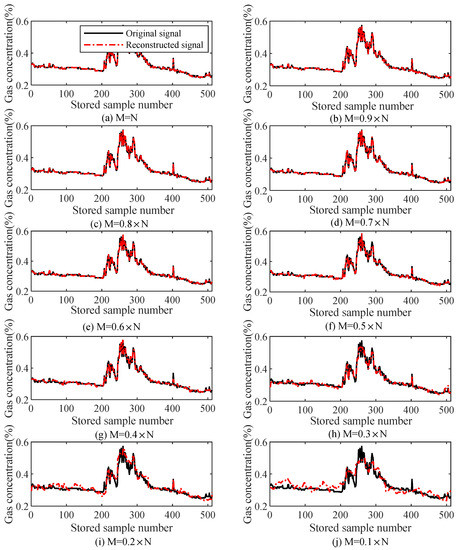 Figure 10 illustrates the relationship between the reconstruction error and the compression ratio for different gas signals with different sparseness degrees during which the signals were reconstructed using the TVS-MH algorithm and the signal length was 512 (N = 512). It can be observed that for K-sparse signals, the greater the value of K is, the higher the reconstruction error is.
