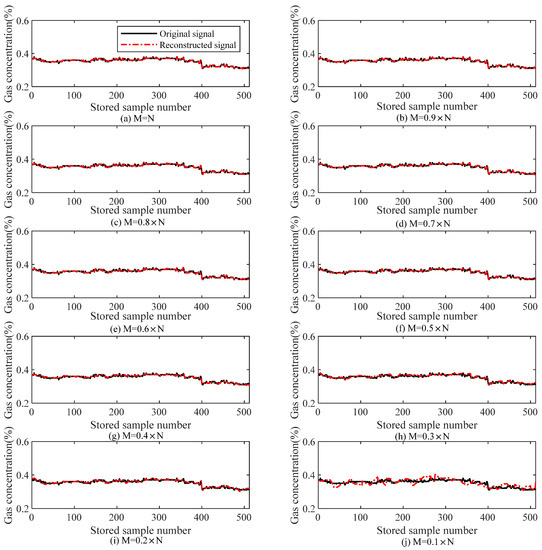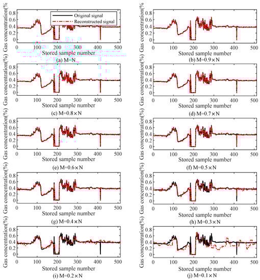Table 3 lists the relationships of M with the reconstruction error and iteration number (i.e., the computation complexity) during the reconstruction of gas data using the TVS-MH algorithm, and Figure 8 illustrates the effect of the number of measuring points (M) on the reconstruction performance of a complex gas signal. It can be observed that since the gas signal varies intensively, the reconstruction accuracy is lower than that under the gas mutation state at the same compressive rate. When the compression ratio is equal to or greater than 0.4, the reconstruction error is smaller than 4% and the iteration number is smaller than 100.