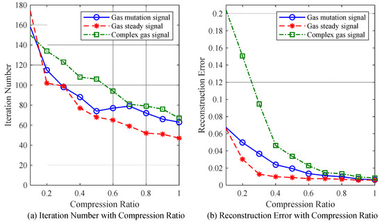 Figure 9 illustrates the relationships of the compression ratio with reconstruction error and iteration number for the reconstruction of three different gas signals (namely the gas mutation signal, the gas steady signal and the complex gas signal) using the TVS-MH algorithm.