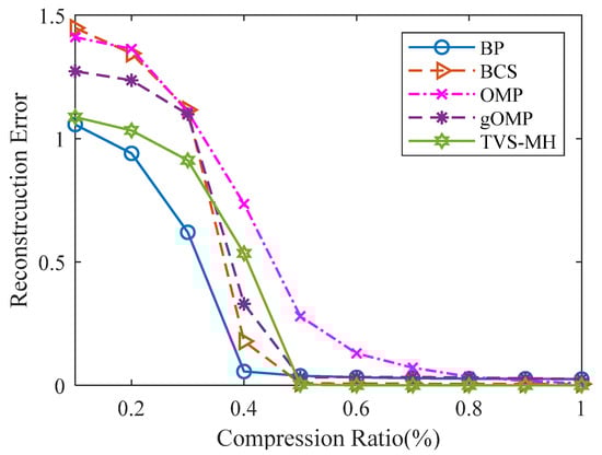 Since the common sparse recovery algorithms can be classified into three main categories, Figure 11 illustrates the relationship between the reconstruction error and the compression ratio for the same sparse gas signal using different reconstruction algorithms, which are Convex and Relaxation (BP, TVS-MH), Greedy (OMP, gOMP), and Bayesian category (BCS). During the tests, a random signal with a sparseness of 50 and a length of 512 (K = 50 and N = 512) was used as the gas signal, and the program ran 100 times to take the average values.
