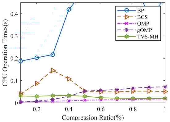 The algorithm complexity can be expressed by program runtime. Figure 12 illustrates the relationship between CPU operation time and the compression ratio for the same sparse gas signal using different reconstruction algorithms. From Figure 12, the processing time and the recovery time of TVS-MH are observed as higher than those of OMP but lower than those of BP, BCS and gOMP. Table 4 presents the testing environment.