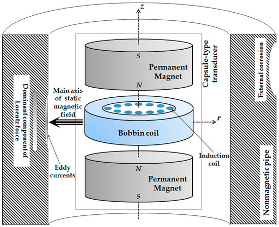 During the inspection of the nonmagnetic pipe using the proposed transducer, the ultrasonic wave is generated and propagates through the pipe body. It gets reflected when encountering the material discontinuities involving: (1) The external surface of the pipe; and (2) the bottom of the external corrosion. The generated and reflected ultrasonic waves vibrate each pipe particle with the velocity of . In the presence of the static magnetic field, the so-called velocity-induced eddy current is induced, which is constituted by the identity:
