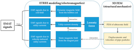 In the presence of external corrosion symmetrical characteristics of the ultrasonic field can barely hold, the 3D model in lieu of 2D model particularly regarding the ultrasonic simulation is preferred. However, because the excitation frequency of EMATs is normally over 1 MHz, the electromagnetic field and excitation source of the ultrasonic field (i.e., the Lorentz force) in the nonmagnetic pipe are concentrated over the pipe inner surface, and hardly perturbed by the external corrosion. Therefore, the analytical modeling is applicable for fast and accurate solutions to the related electromagnetic quantities. In light of this, a 3D hybrid model integrating the analytical modeling i.e., the Extended Truncated Region Eigenfunction Expansion (ETREE) modeling for solving electromagnetic problems [16,17,18] with 3D FEM for simulations of the ultrasonic field [8] is proposed. The schematic illustration of the 3D hybrid model is portrayed in Figure 2. It is noted that the advantage of the ETREE modeling over Dodd and Deeds’ model lies in the fact that it replaces the integral term of magnetic vector potential with a series of proper eigenfunctions, saving much computing effort for solutions to electromagnetics without sacrificing accuracy [16].