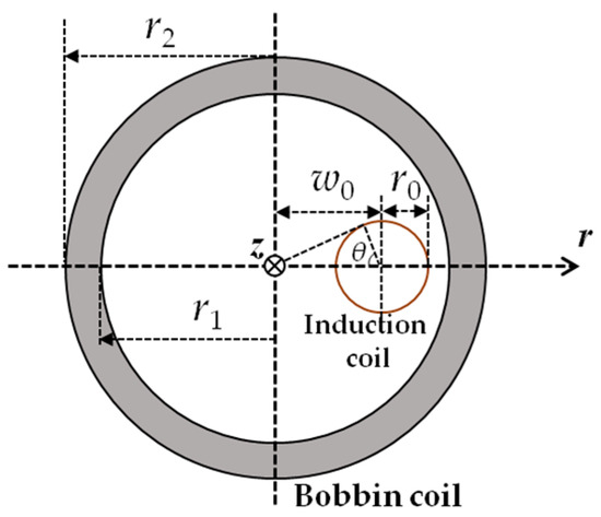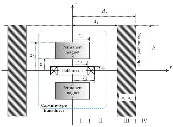 Compared with full FEM simulations of EMATs, the significant difference of the 3D hybrid model lies in the fact that it employs ETREE modeling for solutions to field quantities related to electromagnetics. Therefore, the 3D hybrid model inherits the advantages of ETREE modeling over FEM in terms of explicit expressions of field quantities, high computational accuracy and speed. This facilitates the theoretical investigation regarding electromagnetic phenomena underlying EMATs and particularly prediction of EMAT signals. The rest of the section is hereby focused on the electromagnetic problems related to the proposed transducer, and elaborates the formulation of closed-form expressions of the field quantities and EMAT signals via ETREE modeling. Since the symmetric characteristics of the electromagnetic field hold regardless of the presence of the external corrosion, the 2D axi-symmetric model for ETREE modeling with the proposed capsule-type EMAT deployed in a nonmagnetic pipe (with the conductivity of σ1 and relative permeability of , ) applies, and is presented in Figure 3.