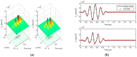 Before the hybrid model is exploited for simulations regarding detection and evaluation of external corrosion with the proposed transducer, it is corroborated by using the full FEM simulation [11,24] where the electromagnetic field, ultrasonic field and resulting signal from the induction coil are calculated without the analytical modeling involved. Note that in a bid to obtain simulation results without much loss in accuracy, in full FEM simulations the number of hexahedral mesh elements is up to 1 × 107 whilst the convergence error is set as 1 × 10−6. The parameters of the transduer and nonmagnetic pipe are listed in Table 1 and Table 2. The permanent magnet is the N38-type NdFeB magnet. The excitation current (with the excitation frequency of 5 MHz and tone burst width of 1 μs) driving the bobbin coil is presented in Figure 5. The computed r-component and z-component of the Lorentz force (i.e., Fr and Fz) in the pipe (r = 16.01 mm) against the axial distance z (−10 mm ≤ z ≤ 10 mm) are shown in Figure 6a. It is noteworthy that each component of the Lorentz force is the sum of the corresponding components of and . The Lorentz forces at a position (r = 16.01 mm, z = 0.5 mm) in the pipe which are predicted using the hybrid model and full FEM are compared and exhibited in Figure 6b. The comparison of the resulting signal from the induction coil via the hybrid model with that via full FEM is shown in Figure 7.