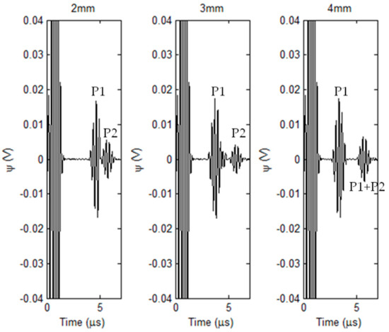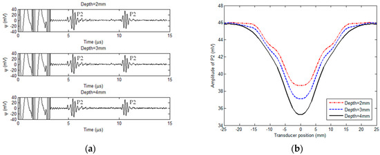 Special attention has been given to the amplitudes of P1 and P2 in the EMAT signal. It is noticeable from Figure 11a that for each corrosion scenario the amplitude of P1 is higher than that of P2. At the position of the induction coil, stronger reflection of the ultrasonic wave occurs at the corrosion bottom than that at the pipe external surface. As a result, the ultrasonic wave reflected from the corrosion gives the dominant contribution to the EMAT signal compared with the wave from the pipe external surface, leading to higher amplitude of P1 than that of P2. The analysis indicates that in the presence of corrosion, the magnitude of P2 decreases due to wave reflection from the corrosion. Since the bobbin coil in the proposed transducer can also be used for acquisition of testing signals, the external corrosion could be detected by analyzing the P2 amplitude of the signal from the bobbin coil, which is complementary to the corrosion detection by using the signal from the induction coil. For the corrosion with the depth varying from 2 mm to 4 mm and diameter fixed at 10 mm, the acquired signals from the bobbin coil are exhibited in Figure 12a.