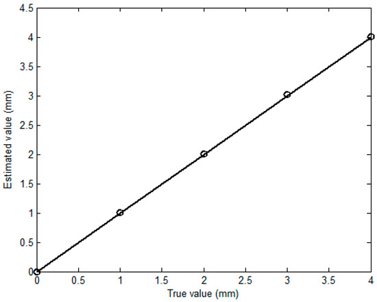 In regard to evaluation of the corrosion depth, the arrival times of P1 and P2 are firstly determined by finding the time instant when the magnitude of the envelope of each pulse reaches maximum. The temporal span is subsequently derived from subtraction of the arrival times regarding P1 and P2. The depth of each detected corrosion is thus approximated by computing the product of the temporal span and propagation velocity of transverse wave in the pipe material (3130.8 m/s). The comparison of the corrosion depth between the approximated and true/predefined values is exhibited in Figure 9. It is noticeable from Figure 9 that the approximated depth of each corrosion has good agreement with the true value. The relative error is less than 1.7%. This indicates that the proposed transducer is applicable for detection and depth evaluation of the external corrosion. The simulation results are also supportive of the validity of the proposed hybrid model, since the temporal span extracted from the predicted signal offers good assessment in regard to the corrosion depth without much loss in accuracy.