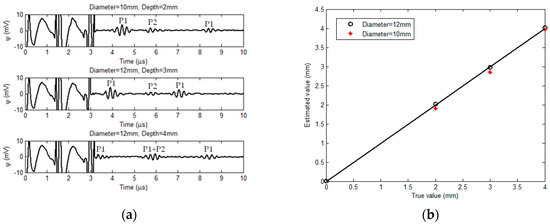 Experimental results: (a) Acquired signals vs. corrosion sizes; and (b) comparison between the approximated corrosion depths and true values.