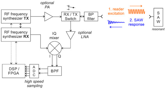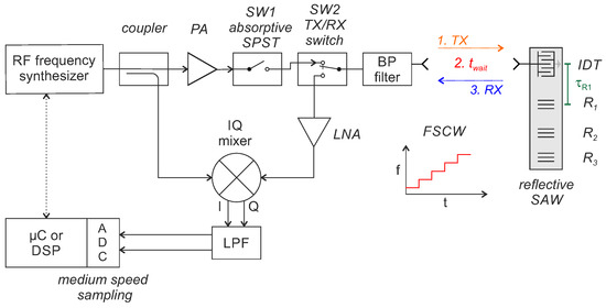 - Scholz, P.; Dierkes, M.; Hilleringmann, U. Low-Cost Transceiver Unit for SAW-Sensors Using Customized Hardware Components. In Proceedings of the 2006 IEEE Ultrasonics Symposium, Vancouver, BC, Canada, 2–6 October 2006; pp. 953–956. [Google Scholar] [CrossRef]