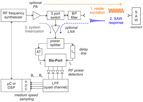 - Weigel, R.; Lurz, F.; Lindner, S.; Mann, S.; Linz, S.; Koelpin, A. A fast and precise Six-Port-based IFM technique for wireless resonant SAW sensing. In Proceedings of the 2016 IEEE International Ultrasonics Symposium (IUS), Tours, France, 18–21 September 2016; pp. 1–4. [Google Scholar] [CrossRef]
