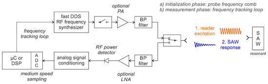- Scheiblhofer, S.; Schuster, S.; Stelzer, A. Modeling and performance analysis of SAW reader systems for delay-line sensors. IEEE Trans. Ultrason. Ferroelectri. Freq. Control 2009, 56, 2292–2303. [Google Scholar] [CrossRef] [PubMed]