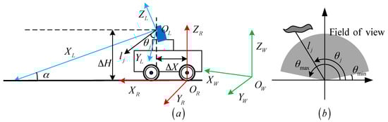 Definitions of the system coordinates. (a) Coordinate system; (b) Laser polar coordinate system.