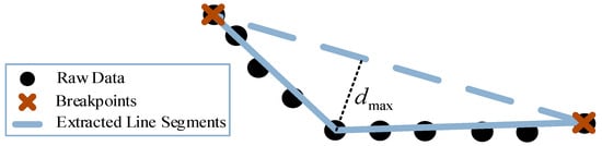 Each point segment with points less than is deleted to make sure that no error points are included in the segments. Then the IEPF algorithm [] is used for separation of line extracted segments as shown in Figure 3. Finally, we get lines at the global coordinate system by using Equation (8) below: