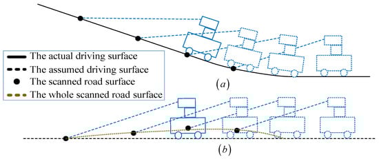 Obstacle detection process. (a) The actual moving surface; (b) The assumed moving surface.