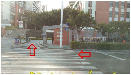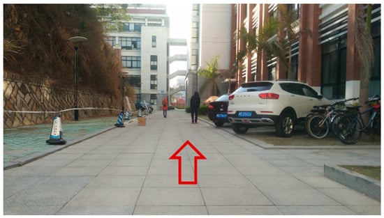 Our testing was conducted within the two outdoor environments shown in Figure 6 and Figure 7. As can be seen, Figure 6 shows the scene of a normal road where the mobile robot was moving forward. At the right of the road, there is a flower bed, two cars parked on side, as well as few bicycles. In the middle of the road, two pedestrians and a box stood there, some road blocks on the left. On both sides of the road, there are other tall obstacles, such as buildings. Figure 7 shows the scene of a school gate, where the robot was moving along the right side of the road (nearby the flower bed) and turned right to enter the school gate. From this picture, we can see that the right shoulder of the road is impassable, and there are obstacles with different height on both side of the campus gate.