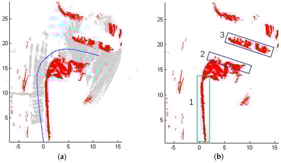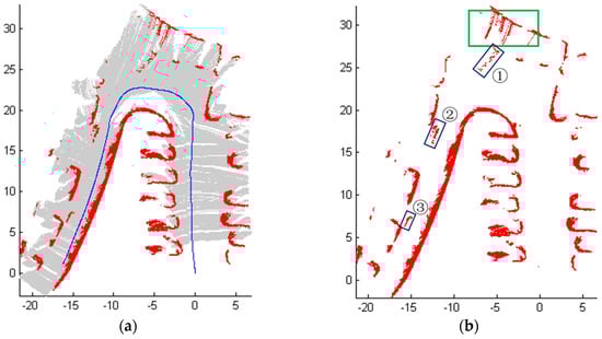 For the Scene 2 (Figure 7), 1350 frames of LiDAR scanning data were obtained when the mobile robot was moving, and the laser-point cloud data are displayed in X-Y plane. The detection results of Scene 2 are shown in Figure 9. Note that Figure 9a is the results of obstacles detection, in which the blue line represents the track of the mobile robot, red points represent the obstacles and the gray area is the travelable area. As shown in Figure 9b, the green rectangle area ‘1’ marks the detected right shoulder of the road, and Areas ‘2’ and ‘3’ are the obstacles on both sides of the gate.