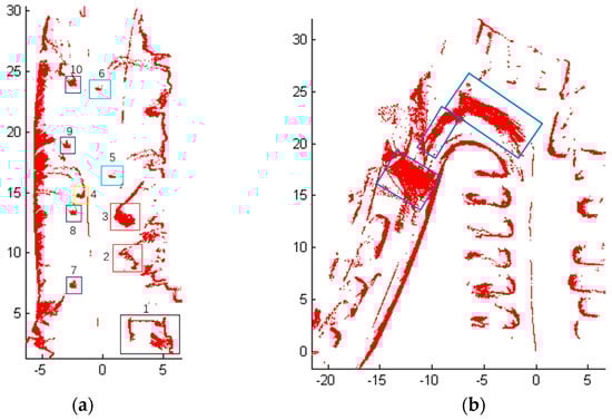 Figure 8 shows the detection results of Scene 1. More specifically, Figure 8a shows the results of obstacles detection, where the blue line represents the track of the mobile robot, which is recorded from the odometer localization of the robot. Red points represent the obstacles and gray areas are the travelable area. Furthermore, it can be seen clearly in Figure 8b that the flower bed on the right is marked as ‘1’ and the cars on the right have been detected and marked as ‘2’ and ‘3’. The box is marked as ‘4’ and the two people in the middle of the road are detected as ‘5’ and ‘6’. Moreover, ‘7’‘8’‘9’‘10’ are the road blocks on the left. The road surface and obstacles on both sides have been detected too.