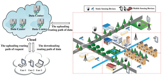 (3) Routing process of uploading data. While sensing devices are collecting data, they upload collected data to DCs at the same time without being requested by DCs. The data collection process in the network model which our work used is similar to crowdsourcing network or participatory network [14,15,16,17,18,19]. Therefore, data packets are uploaded without being requested by the cloud. The routing path in this process is referred to as the routing path of uploading data. This routing path is usually directly built among DCs and DPs. However, using two shortcut routing methods discussed in Section 4, this path would adjust itself to yield shorter overall routing paths.