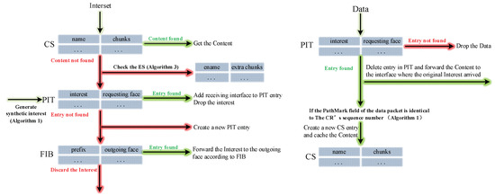 In this section, we discuss data structures related to the CJSR scheme. Our scheme is an improvement based on previous in-network caching schemes and we aim to improve caching mechanisms and reduce the length of routing paths. Firstly, three classic data structures including the Content Store (CS), the Pending Interest Table (PIT) and the Forwarding Information Base (FIB) are used and the lookup procedures are depicted in Figure 2. Other data structures used in the CJSR scheme include: (1) interest packet, which is used by users to request data and to construct a fixed path to facilitate pre-caching; (2) data packet, the function of which is to carry data and relevant information about data (like its destination); (3) Extra Storage (ES), which is a table sharing a similar structure to the Content Store. The ES is used in Algorithm 3 for an idle CR to help store data packets.