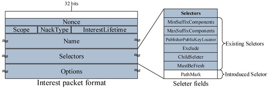 (1) Interest packet format. The structure of an interest packet is demonstrated in Figure 3 (the tilde marks represent that the length of this field is variable). Besides Name and Nonce, Selectors are optional elements that further qualify Data that may match the Interest. They are used for discovering and selecting the data that match best to what the application wants, and this is the place where the PathMark element is added. The aim of adding this element is to record a series of CRs that this interest packet had travelled. Thus, in the CJSR scheme, with the added PathMark, a DC or a DP can construct a fixed path to facilitate pre-caching. The reason for constructing such a path is to providently assign data packets into CRs in a controllable way. Traditionally, data packets would be sent back through the transmission path of interest packets. Therefore, it is reasonable to use this path to assign the predicted data packets to conduct pre-caching. To enable DPs or DCs to construct this path after receiving an interest packet, CRs and users would add their sequence number to an interest packet when they forward it, so the is recorded in the Selecters field.