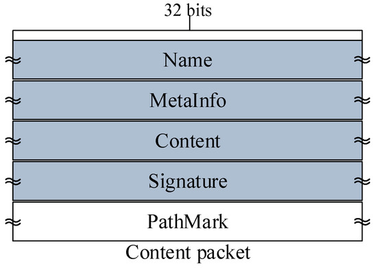 (2) Data packet format. A data packet represents some arbitrary binary data held in the Content element together with its Name, some additional bits of information (MetaInfo), and a digital Signature of the other three elements. The Name is the first element since all NDN packet processing starts with the name. Signature is put at the end of the packet to ease the implementation because signature computation covers all the elements before it. To assign each data packet to its correct location in pre-caching, we add a PathMark field to data packets as it is shown in the white field of Figure 4. This field is used as the indication of a data packet’s destination. Thus, would be added to the PathMark field of a produced data packet; when a CR receive a data packet, it checks whether the is same as its own sequence number and forwards this packet to next CR along the if the does not matched.