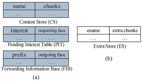 (3) Extra Storage (ES). Figure 5b illustrates this data structure. To address the scarcity of storage space, we introduced the ES to use idle CRs. The structure and storage capacity of the ES and the CS is similar, each “extra chunks” is mapped to an “ename”. When a CR on the asks an idle CR to cache a data packet on its behalf, relevant information is stored in the “ename” and “extra chunks” entries of the ES for future reference.