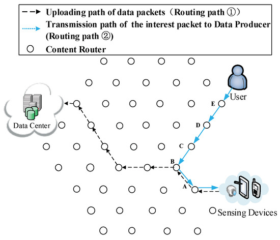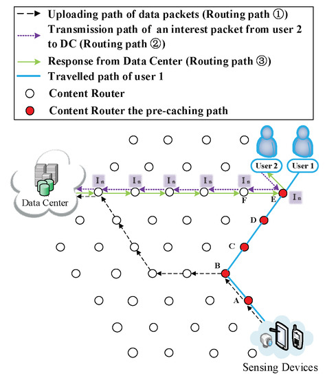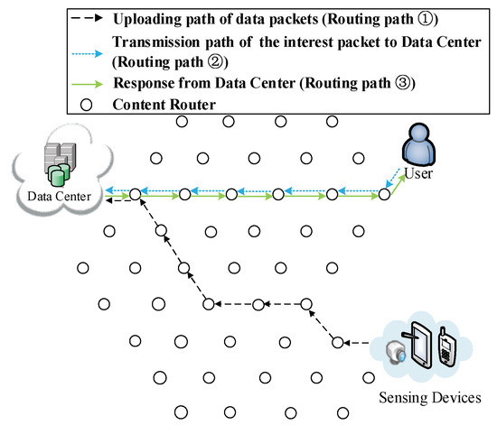 The conventional Cloud Computing model [1,25,28,34] and the Sensor-Cloud Network [28,34] have to face considerable challenges brought by the rapid development of ubiquitous sensing [42,43,44]. In a traditional model, all the sensed data collected by sensing devices have to be uploaded to DCs which are located in the cloud, then it is DCs’ job to reply every incoming interest packet with a data packet with a specified size and name same as in that interest packet. Nevertheless, this model has a few disadvantages: (1) It causes heavy traffic load for DCs and backbone network because the network center where DCs are located is the core of data computing and downloading [45,46]. On the one hand, DCs have the burden of computation and data downloading. On the other hand, tons of streaming data collected from sensing devices are uploaded to DCs, which results in significant traffic flow between DCs and backbone network. (2) Traditional model can lead to poor Quality of Service (QoS) for users [47]. To obtain the first-hand information such as emergency events, public hot issues, or interesting news, users have to go through some prolonged routing processes. Firstly, newly sensed data are uploaded towards DCs; secondly, users request their interested data from DCs; and, finally, demanded data would be transferred from DCs to users. Therefore, these interacting processes result in long delay for a user to get requested data and aggravate the burden of network, thereafter it is the time lag of data transmission that causes poor QoS. Nowadays, located on the edge of the network, many devices have high storage capacity but their potential has not been fully exploited. State-of-art schemes such as Fog Computing [48] and Edge Computing network [24,45] are trying to make use of the resources on the edge of network. However, if the fundamental processes remain unchanged, the abundant computation and storage resources cannot be fully exploited.